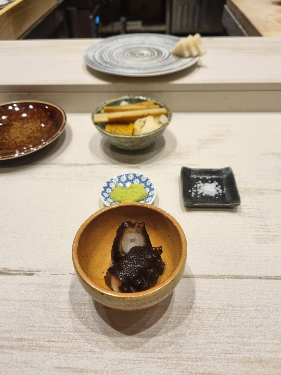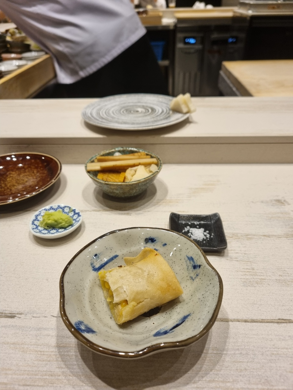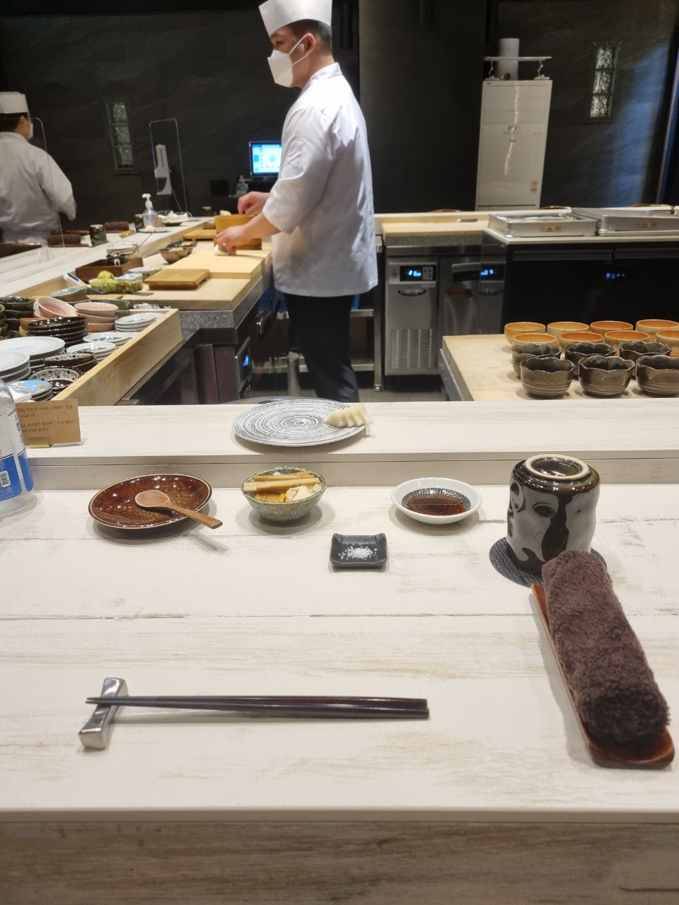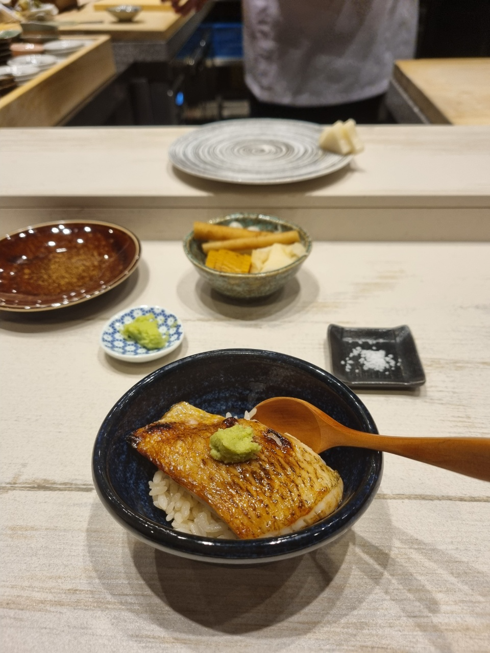 아 추가로 와사비에 대해서 말을 하자면 스시에 넣는 와사비는 제품을 사용하는 것 같았고 내 앞에 작게 와사비 그릇에 놔두는 와사비는 뿌리 와사비를 갈아서 주었다. 뿌리 와사비긴 했는데 향도 약하고 매운 맛도 약하고 거의 무우 맛에 가까운 와사비여서 와사비 리필만 3~4번 한 것 같다.