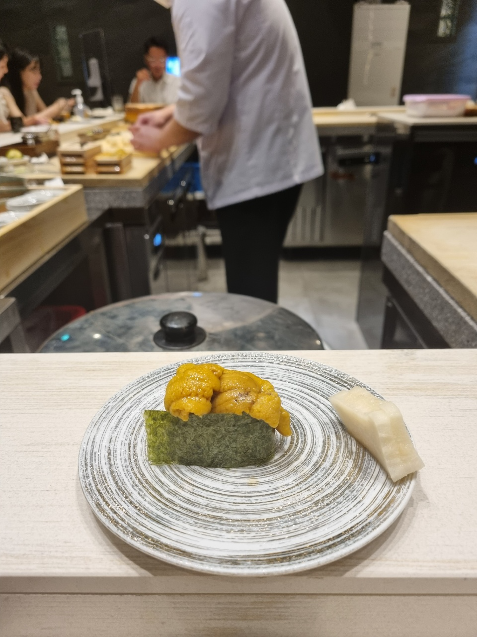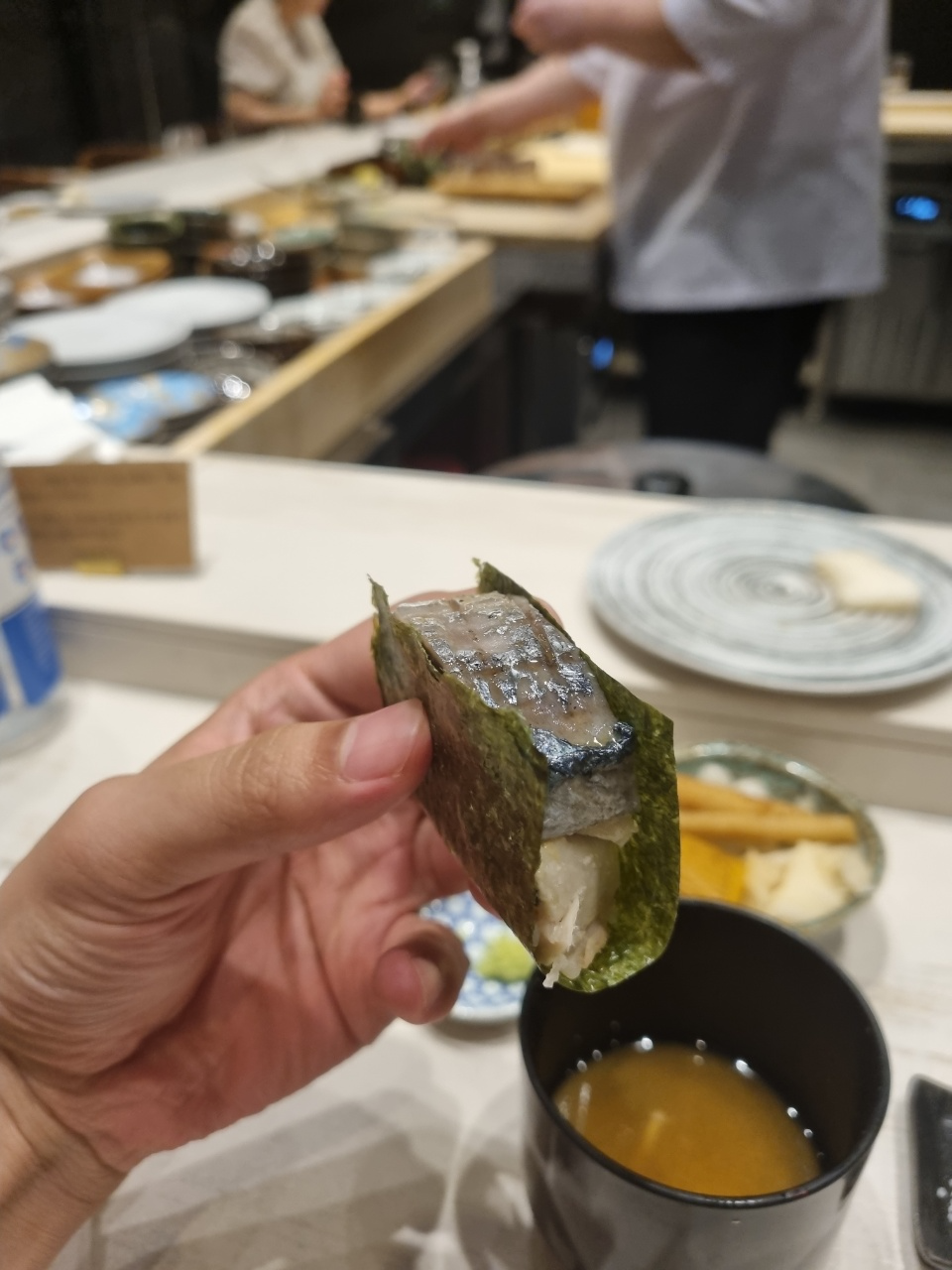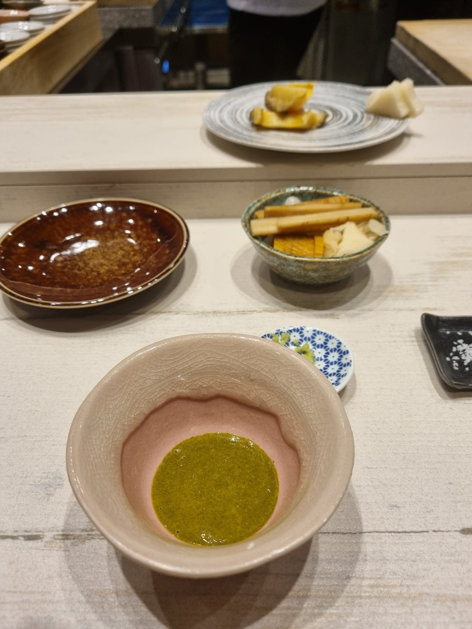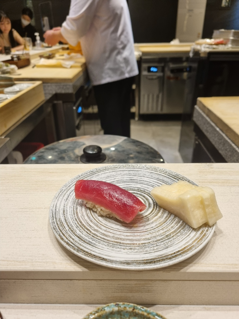 아 추가로 와사비에 대해서 말을 하자면 스시에 넣는 와사비는 제품을 사용하는 것 같았고 내 앞에 작게 와사비 그릇에 놔두는 와사비는 뿌리 와사비를 갈아서 주었다. 뿌리 와사비긴 했는데 향도 약하고 매운 맛도 약하고 거의 무우 맛에 가까운 와사비여서 와사비 리필만 3~4번 한 것 같다.