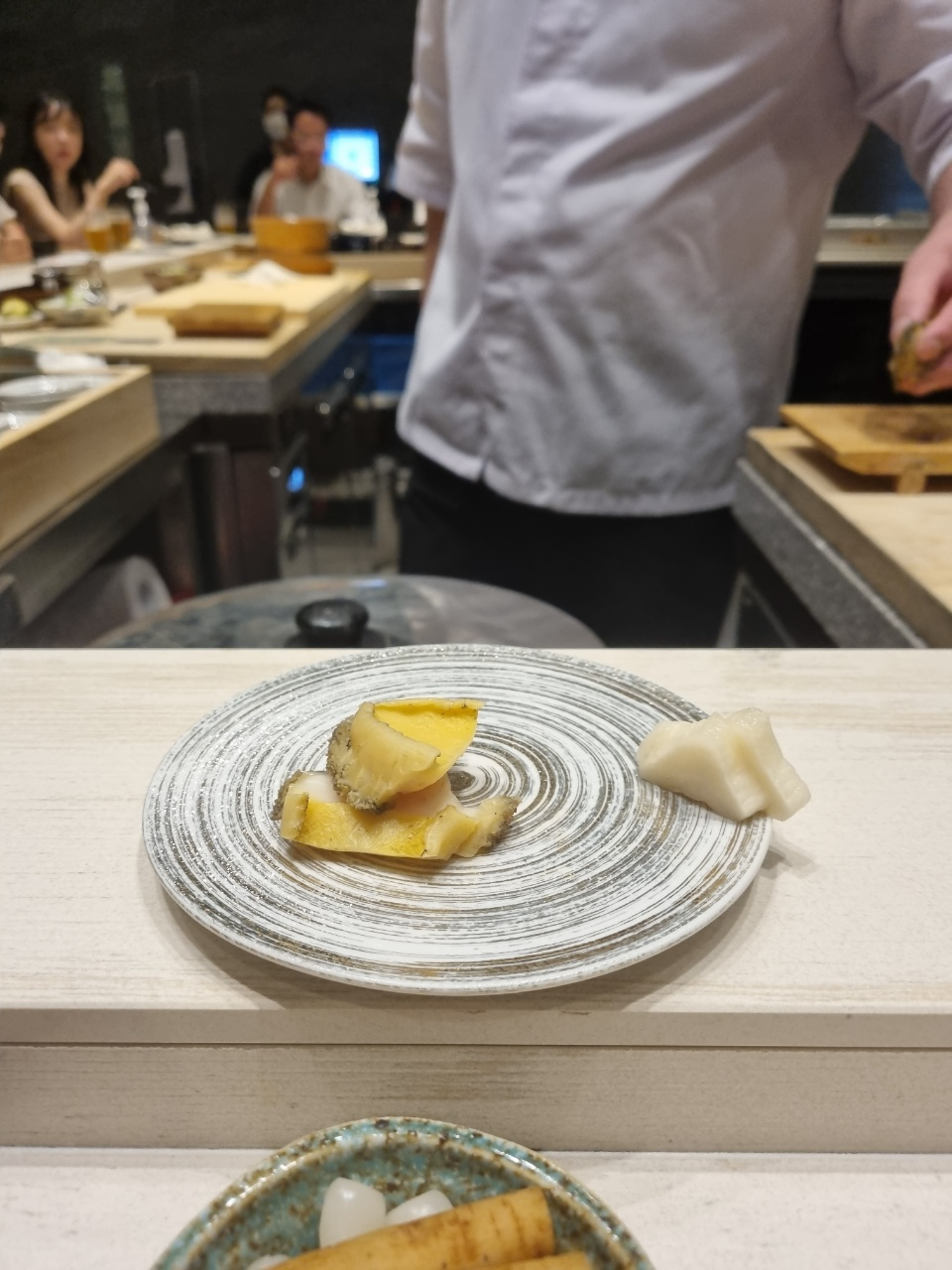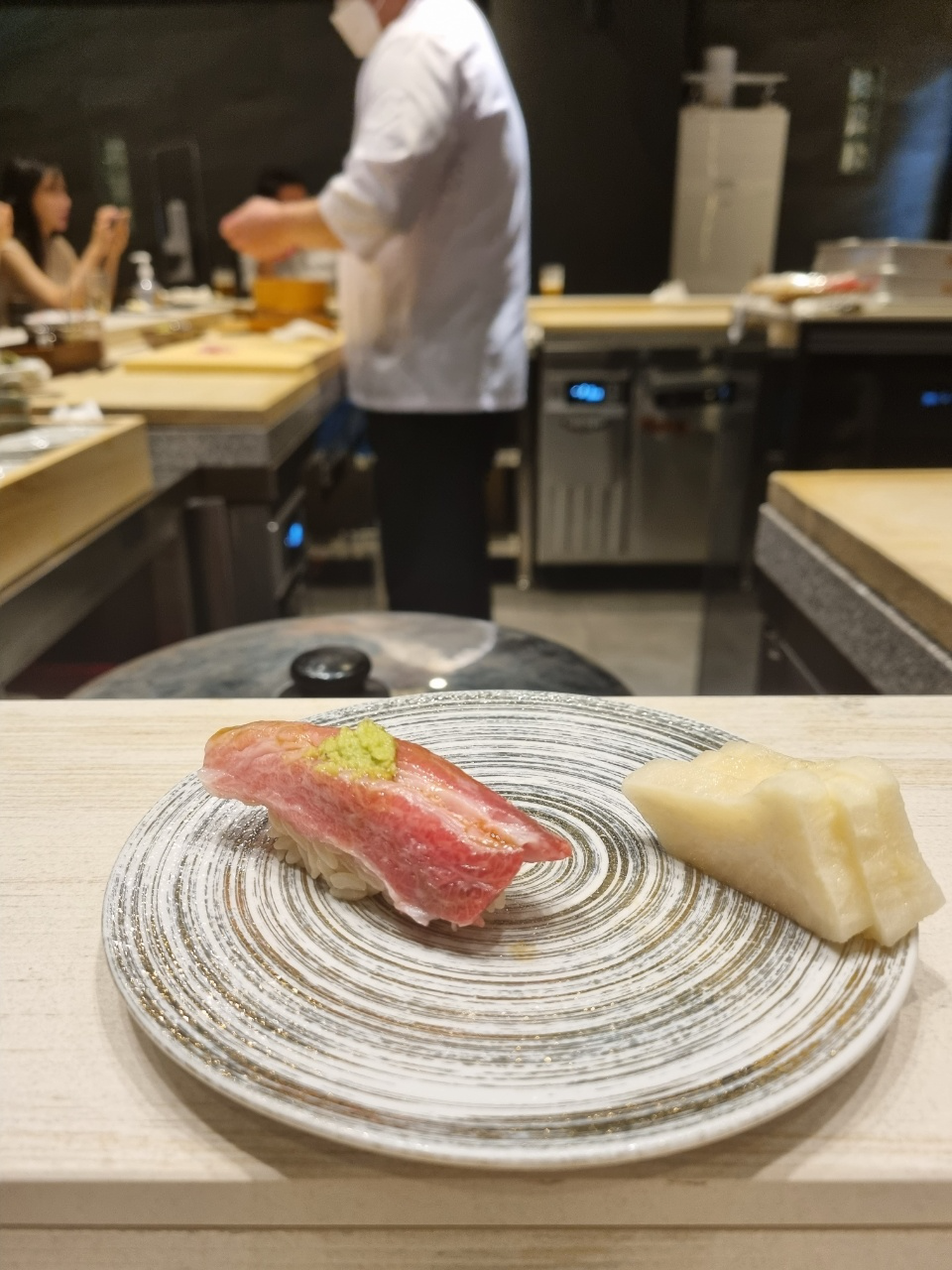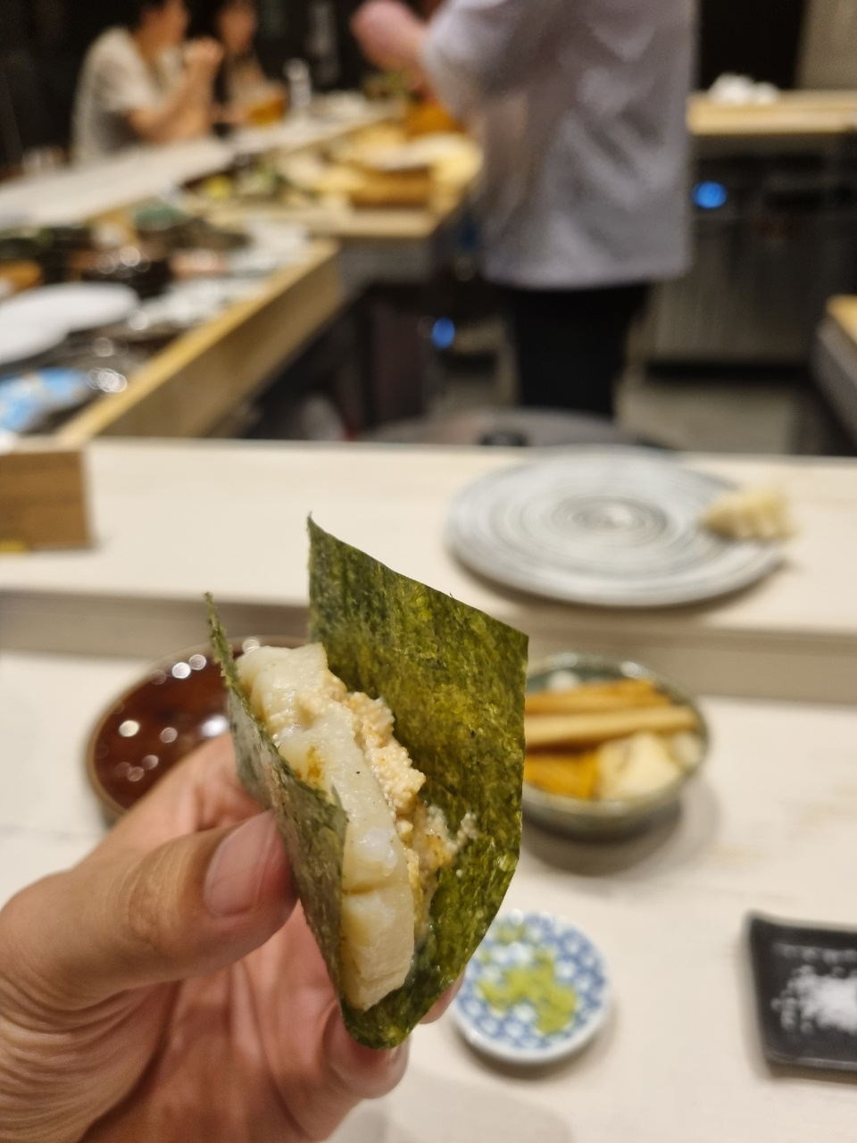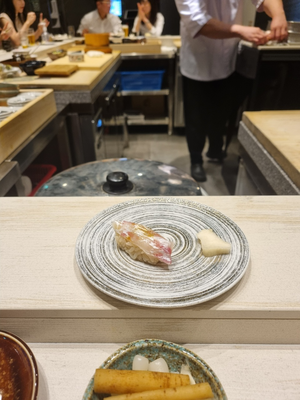 스시 첫점은 도미가 나왔다. 처음 스시를 받고나서 든 생각이 아 스시 크기가 좀 작구나!라고 생각했다. 그리고 입에 넣었을 때 너무 강렬한 맛이나서 도미의 맛을 느낄 수가 없었다. 먹고나서 물어보니까 안에 유즈코쇼를 넣었다고 하는데 이런 흰살생선에 파도 아니고 그렇게 강렬한 맛을 넣으면 좀 아닌 것 같다는 생각을 하고 첫점에서 좀 실망을 했다.
