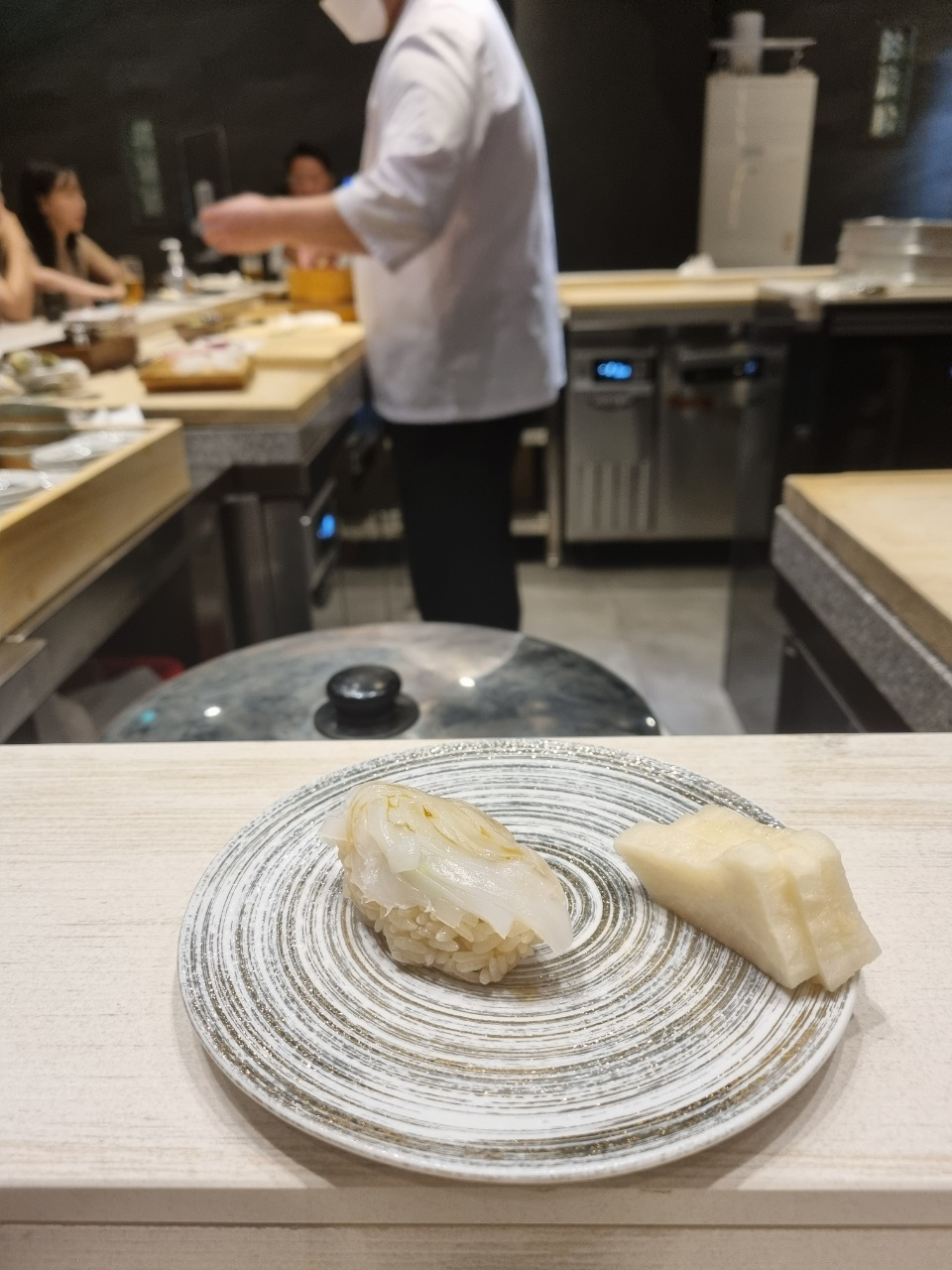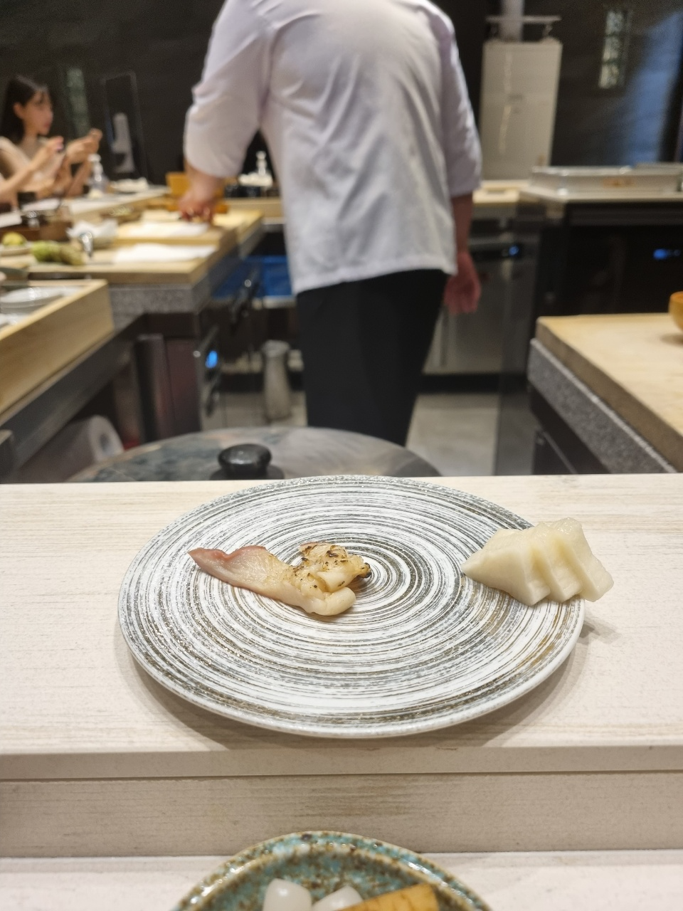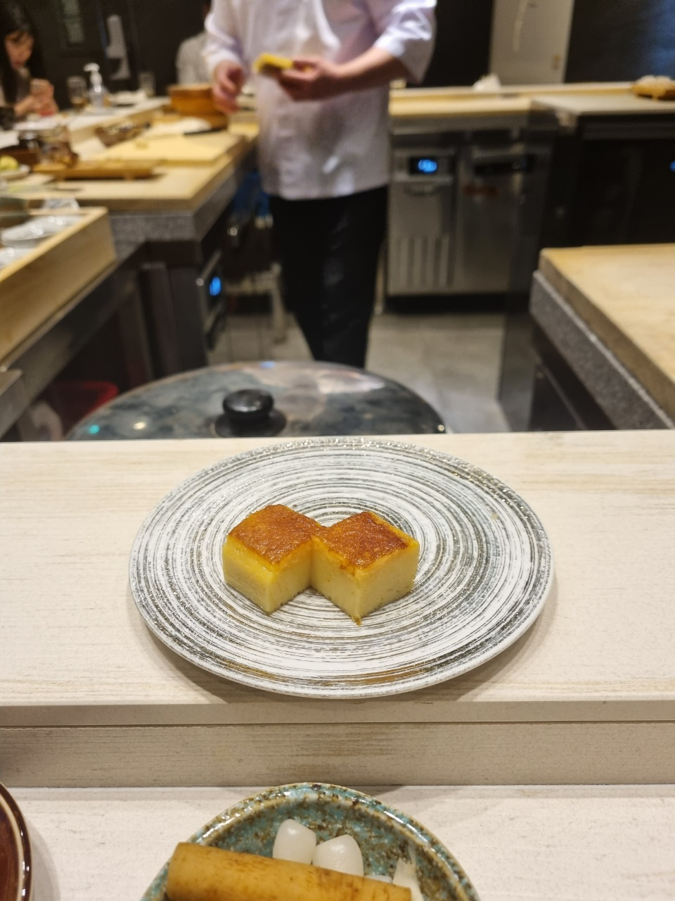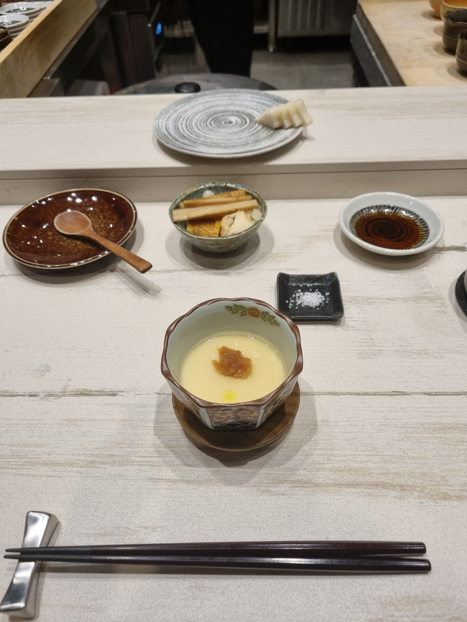 스시 첫점은 도미가 나왔다. 처음 스시를 받고나서 든 생각이 아 스시 크기가 좀 작구나!라고 생각했다. 그리고 입에 넣었을 때 너무 강렬한 맛이나서 도미의 맛을 느낄 수가 없었다. 먹고나서 물어보니까 안에 유즈코쇼를 넣었다고 하는데 이런 흰살생선에 파도 아니고 그렇게 강렬한 맛을 넣으면 좀 아닌 것 같다는 생각을 하고 첫점에서 좀 실망을 했다.