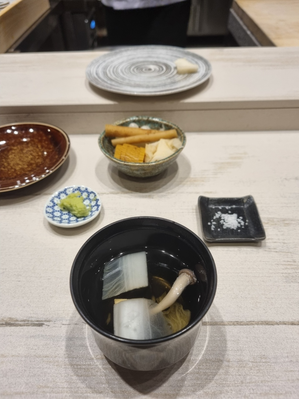 맑은 국인 스이모노가 나왔다. 이 타이밍에 항상 나오는 거긴 한데 특히 이게 맘에 들었던게 나는 어패류가 들어간 국을 싫어하는데 여기에는 어패류가 들어가지 않고 야채로만 육수를 내서 내가 싫어하는 어패류 국물맛을 느끼지 않을 수 있어서 좋았다.
