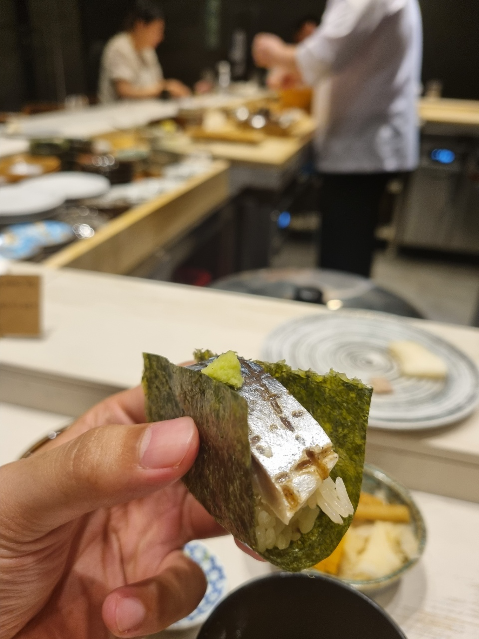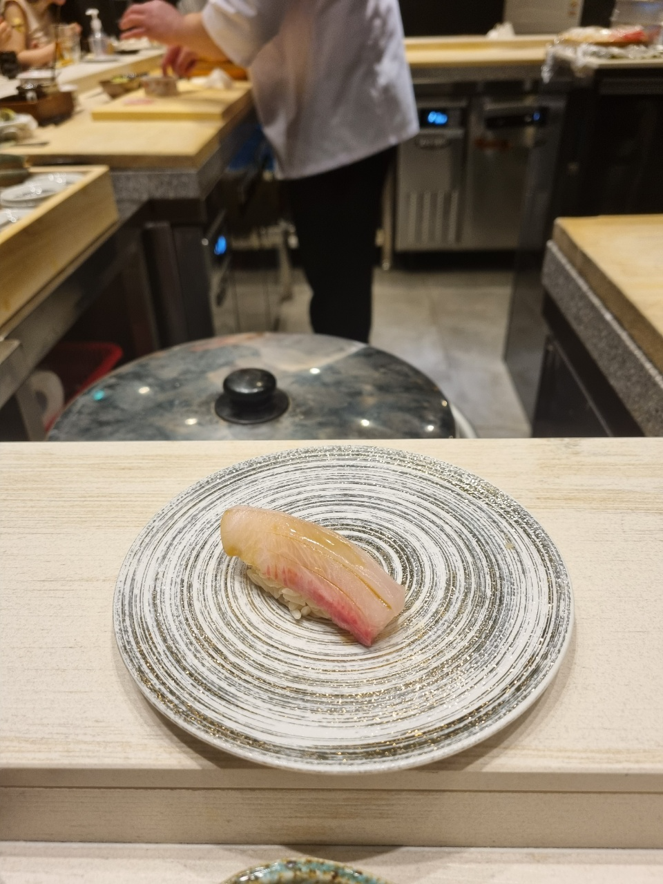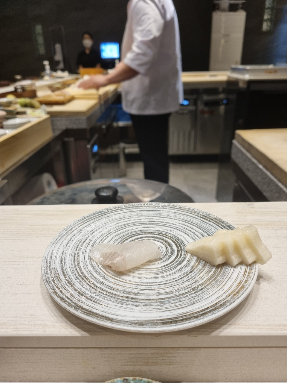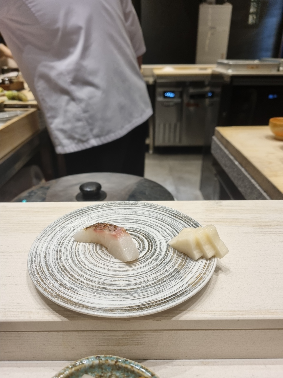 두번째 스시는 잿방어가 나왔다. 여기서 느꼈던 거는 스시에 바르는 간장이 좀 짜다! 그래서 샤리 양을 늘려야겠다! 였다. 이 다음부터 샤리양을 늘려달라고 부탁드렸고 중간중간 와사비가 부족한 것 같을때마다 와사비를 추가로 먹었다.