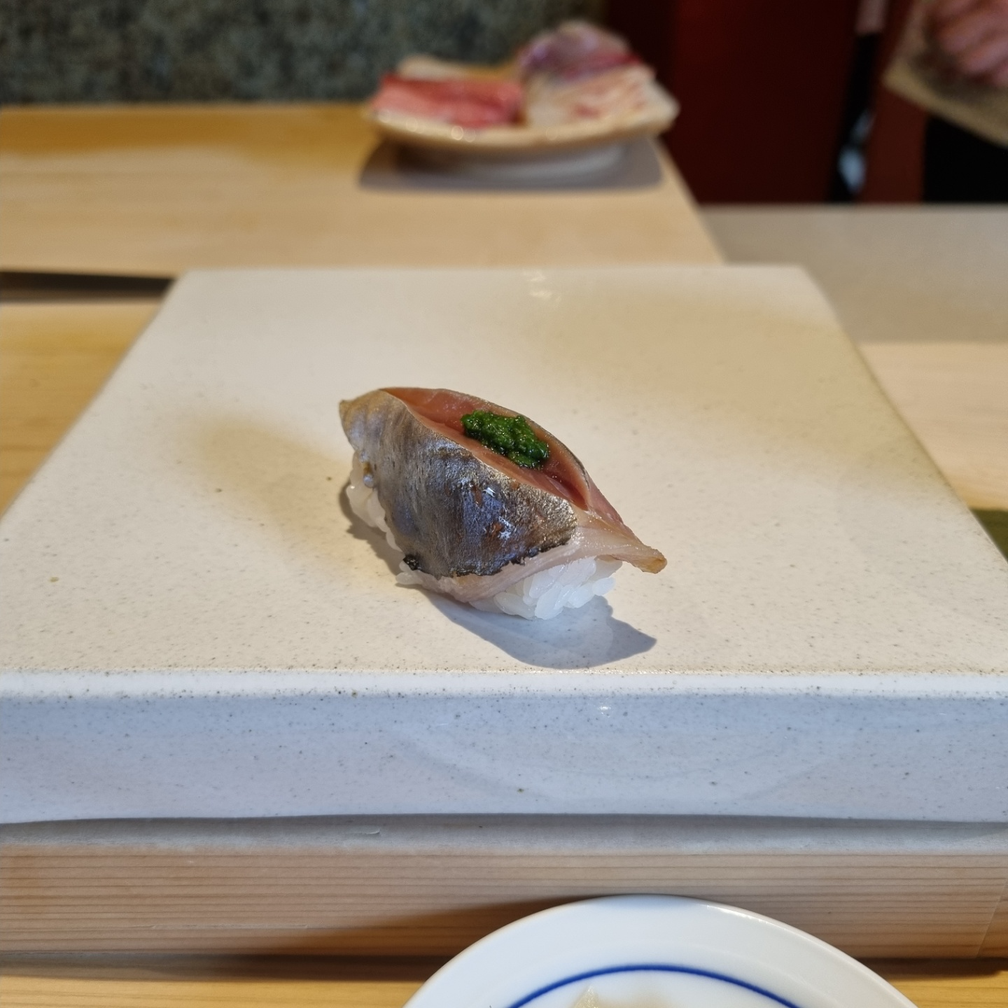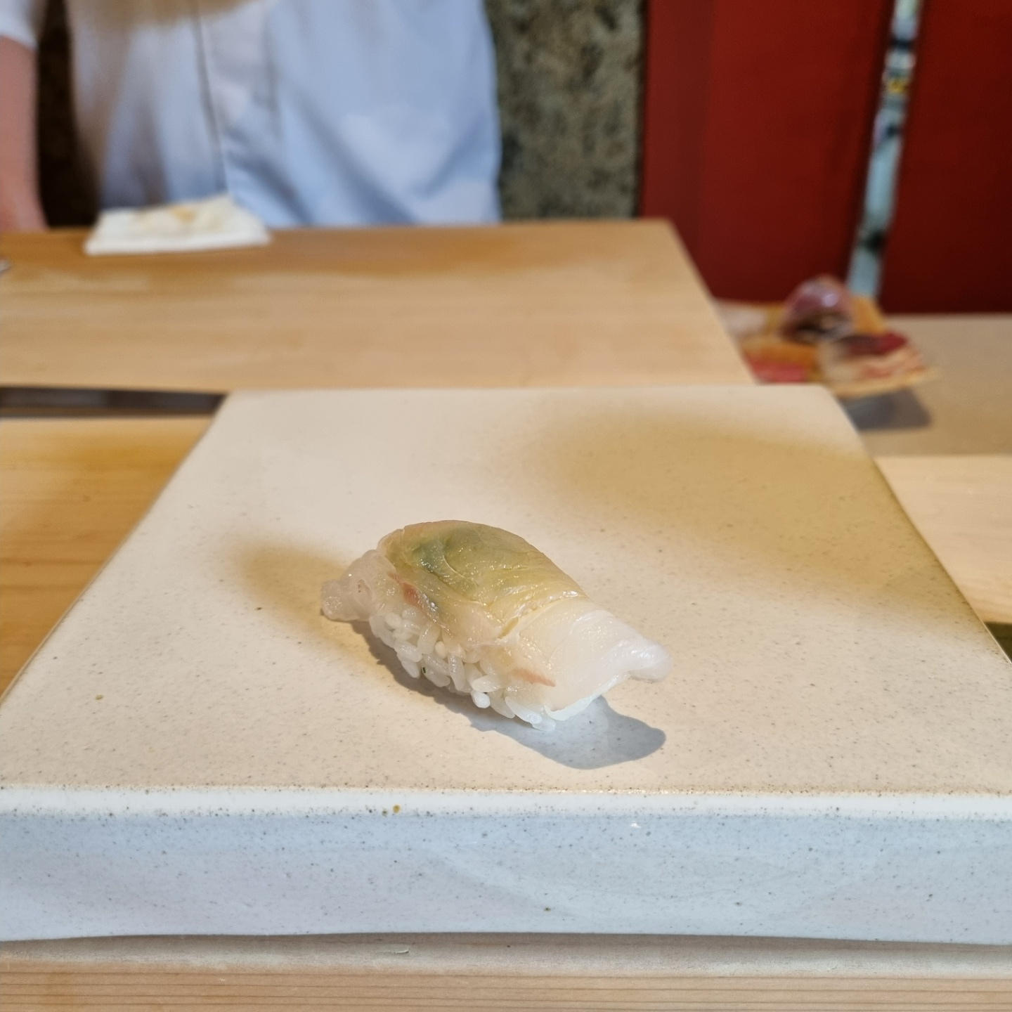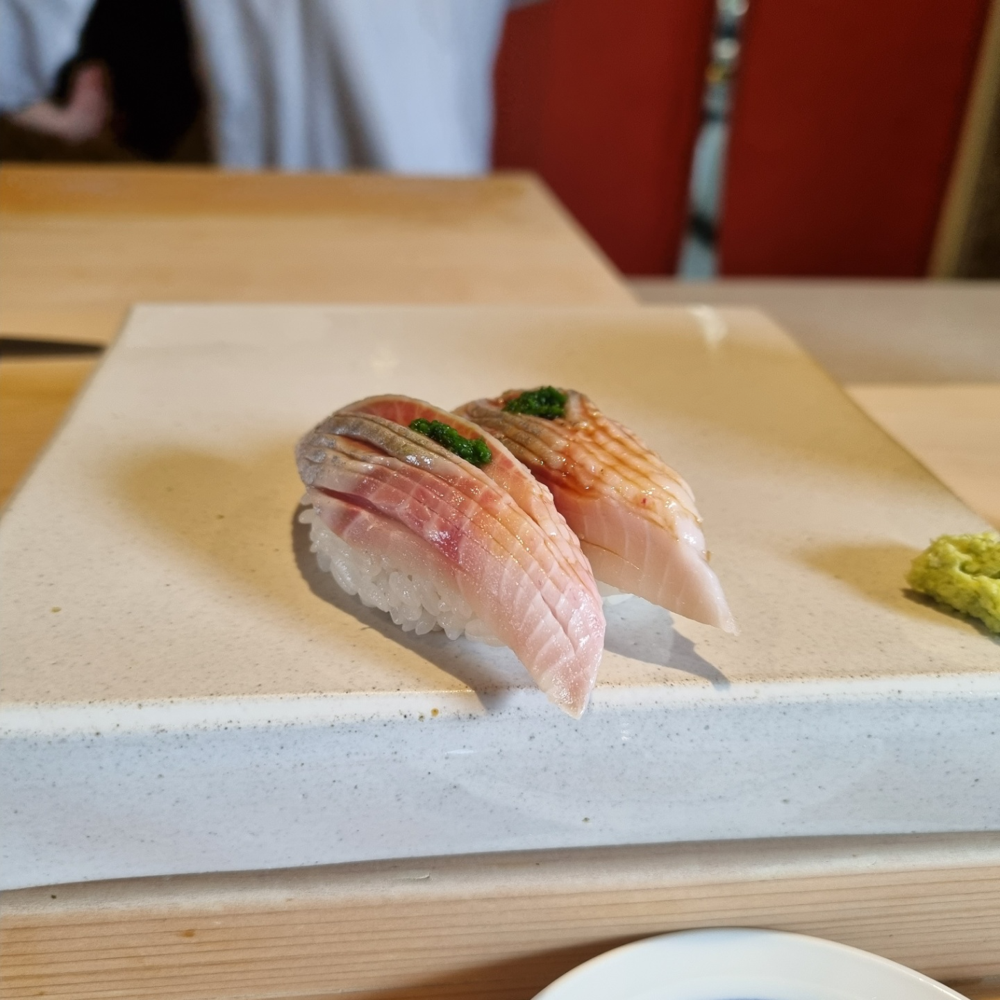 잿방어를 먹으면서 이제 샤리간 + 간장에 적응을 다 한 것 같다. 뭔가 시마아지가 나왔어야 할 것 같은데 왜 잿방어가 나오지... 라고 생각했는데 쉐프님이 얼마전에 시마아지가 일본에서 한국 넘어오면서 전개체가 다 죽어버렸다고 한다.. 그래서 어쩔 수 없이 잿방어를 쓴다고 하셨다. 그래도 시마아지까지는 아니지만 맛있었다.