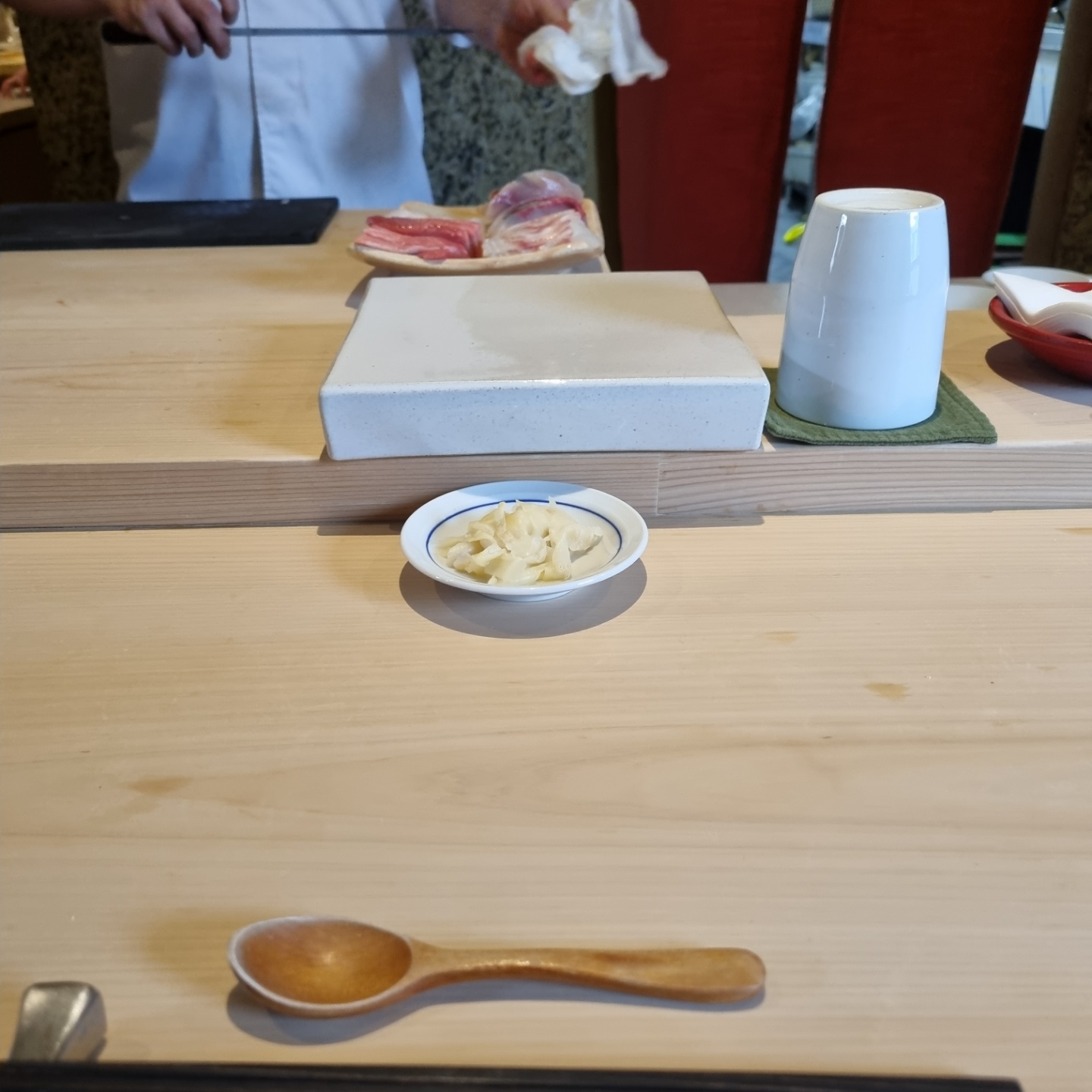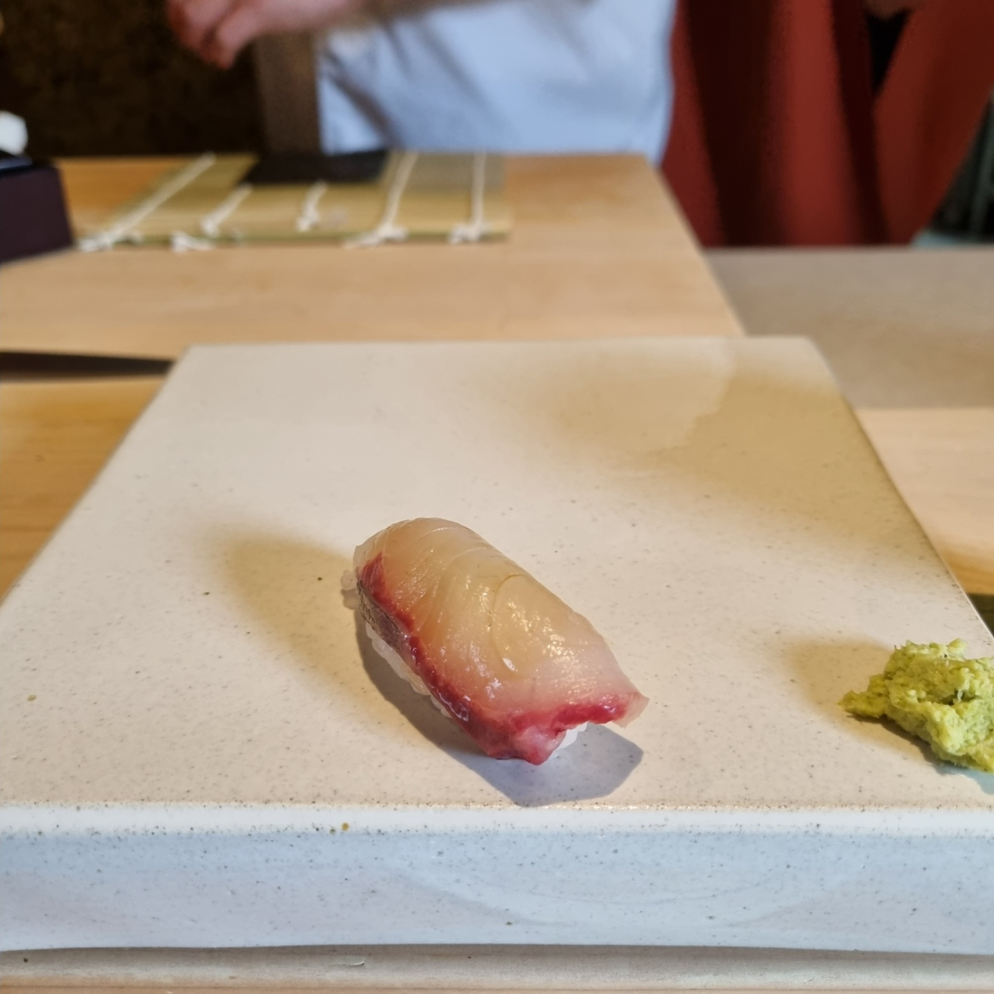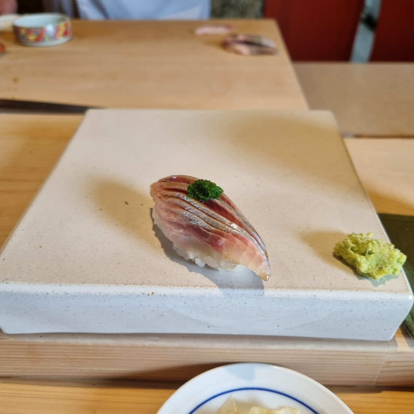 잿방어를 먹으면서 이제 샤리간 + 간장에 적응을 다 한 것 같다. 뭔가 시마아지가 나왔어야 할 것 같은데 왜 잿방어가 나오지... 라고 생각했는데 쉐프님이 얼마전에 시마아지가 일본에서 한국 넘어오면서 전개체가 다 죽어버렸다고 한다.. 그래서 어쩔 수 없이 잿방어를 쓴다고 하셨다. 그래도 시마아지까지는 아니지만 맛있었다.