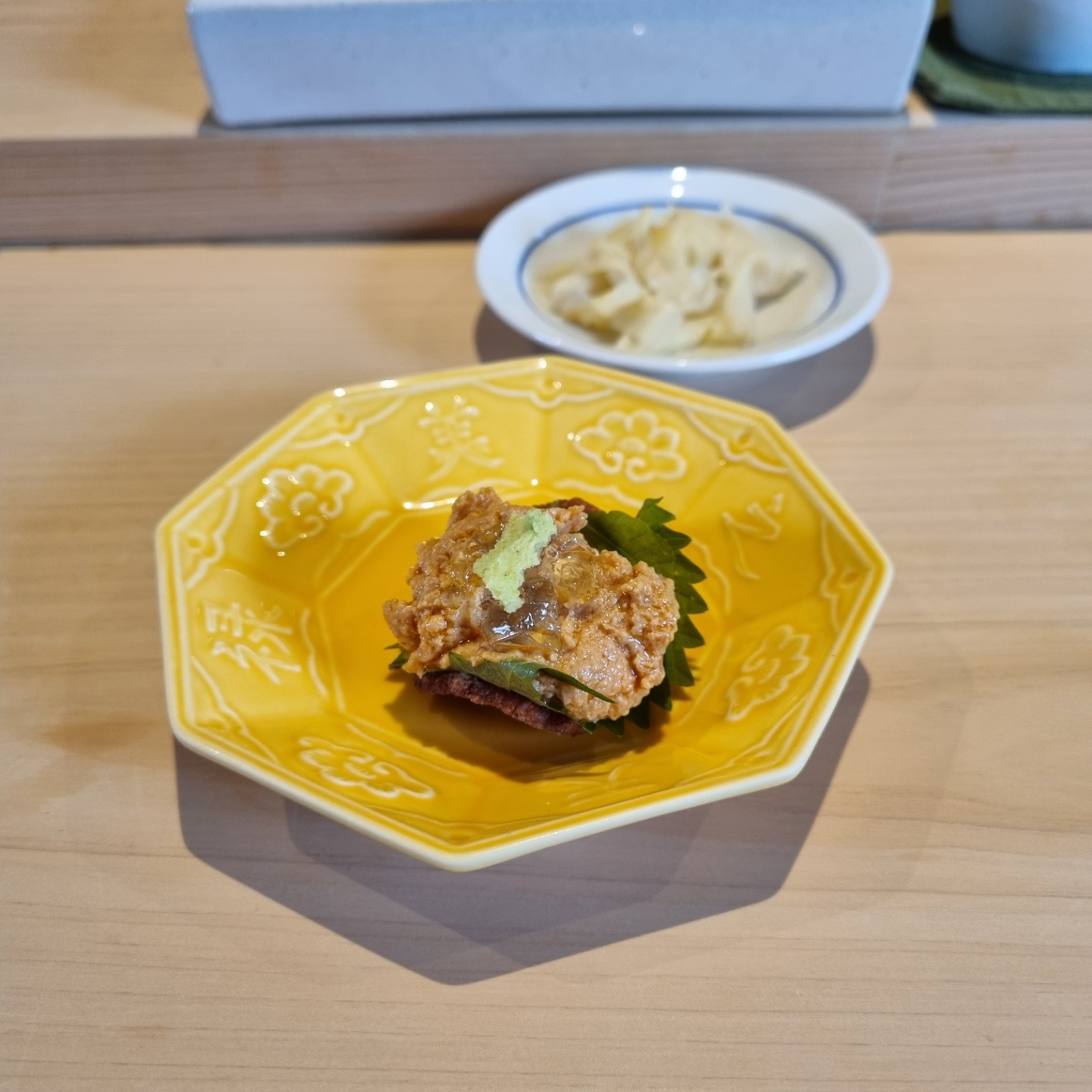 튀긴 연근 위에 시소를 올리고 그 위에 아귀간 젤리로 만든 식초, 와사비를 얹은 츠마미.