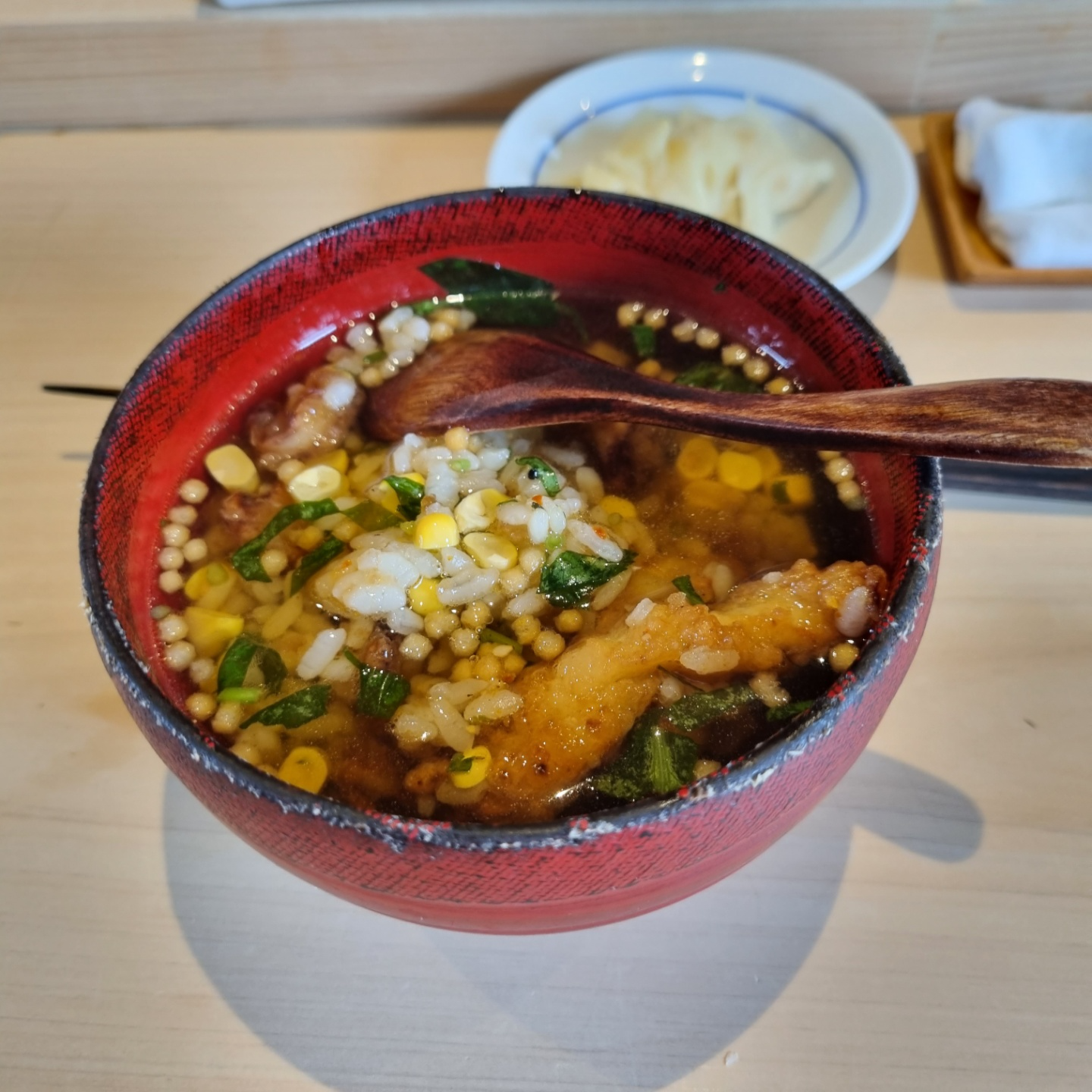 문어 튀긴거 + 초당 옥수수를 솥밥 형태로 만들어서 요리 했다가 나올때는 오차즈케 형식으로 나왔다. 초당 옥수수를 차완무시나 츠마미에서 먹지 않을까 예상하고 왔는데 전혀 예상하지 못했던 곳에서 초당옥수수가 나왔다. 뭐 엄청 특별한 맛의 오차즈케까지는 아니었지만 초당 옥수수가 있어서 맛의 재미를 더했다.