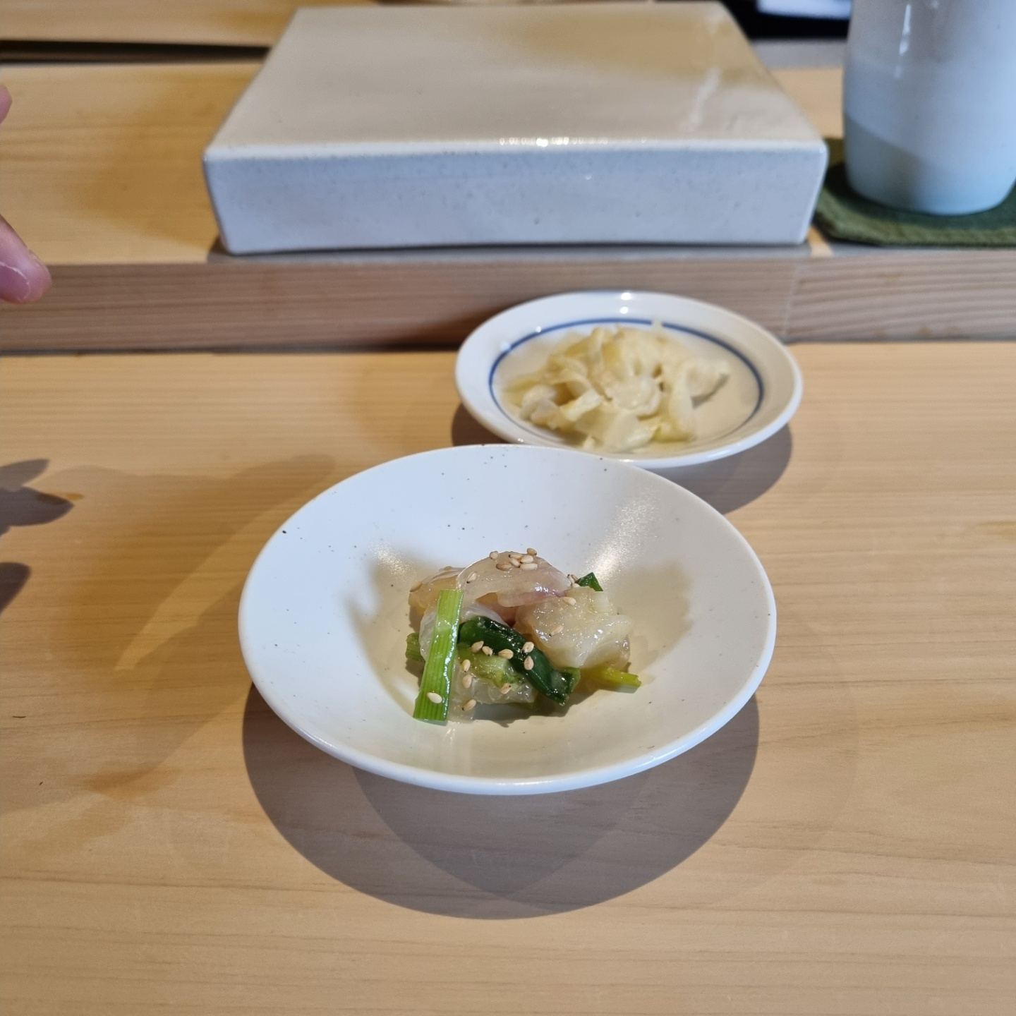 안자마자 더워서 냉수 한잔 원샷 때리니까 바로 나왔던 무침. 무슨 생선이었는지는 모르겠는데 나물이랑 맛있게 무쳐져서 첫 츠마미로 맛있게 먹었다.