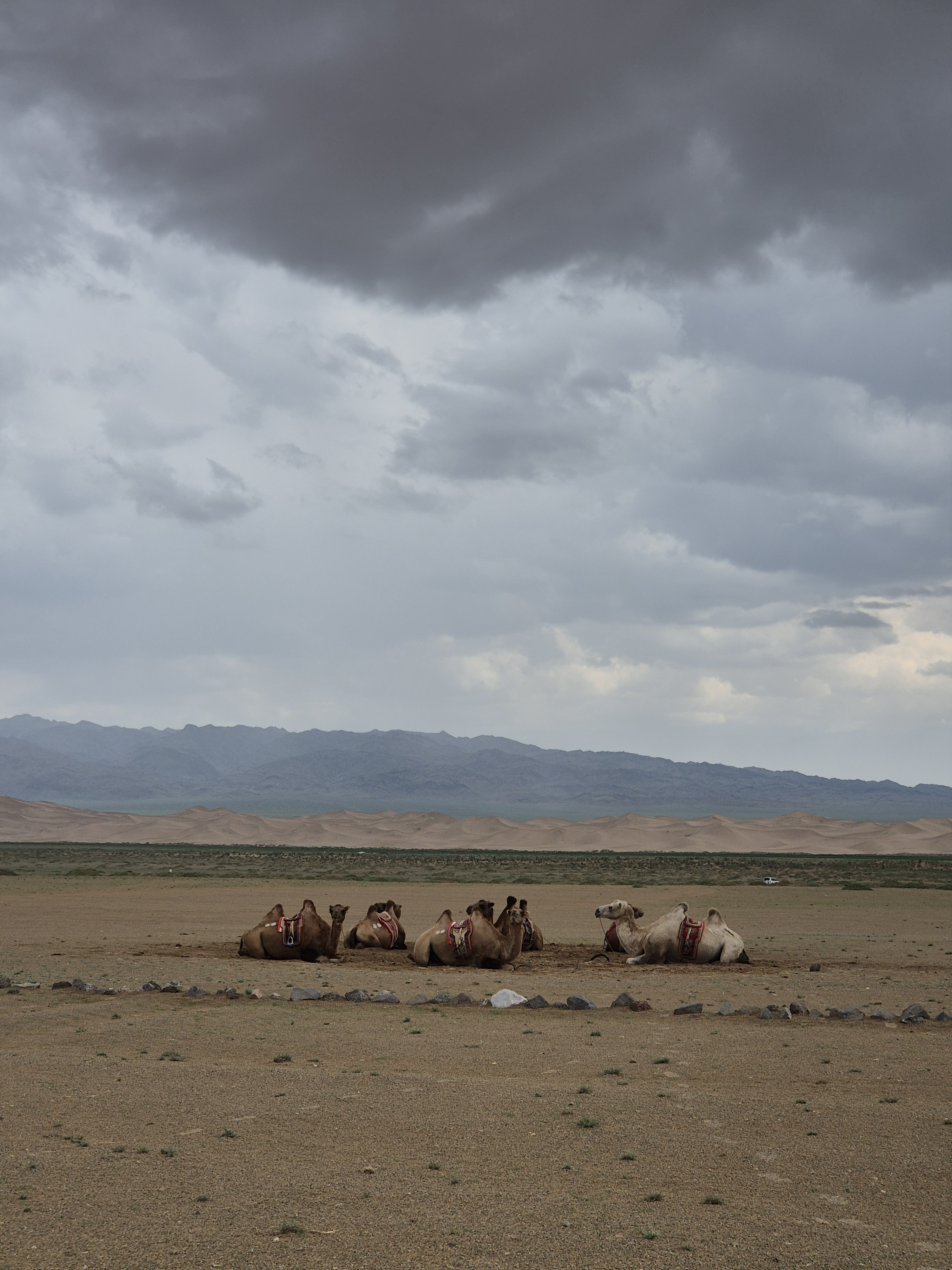 점심을 먹고 일단 낙타를 타기로 했다. 이미 숙소 주위의 다른 게르에서 낙타를 타고 돌아다니고 있었는데 일단 비바람이 굉장히 많이 불고 있었기 때문에 추웠다. 일단 낙타를 타면 냄새가 심해 버릴옷을 입어야 한다고 했기 때문에 옷을 갈아입고, 추운데 바람막이도 못입고 일단 타러갔다.