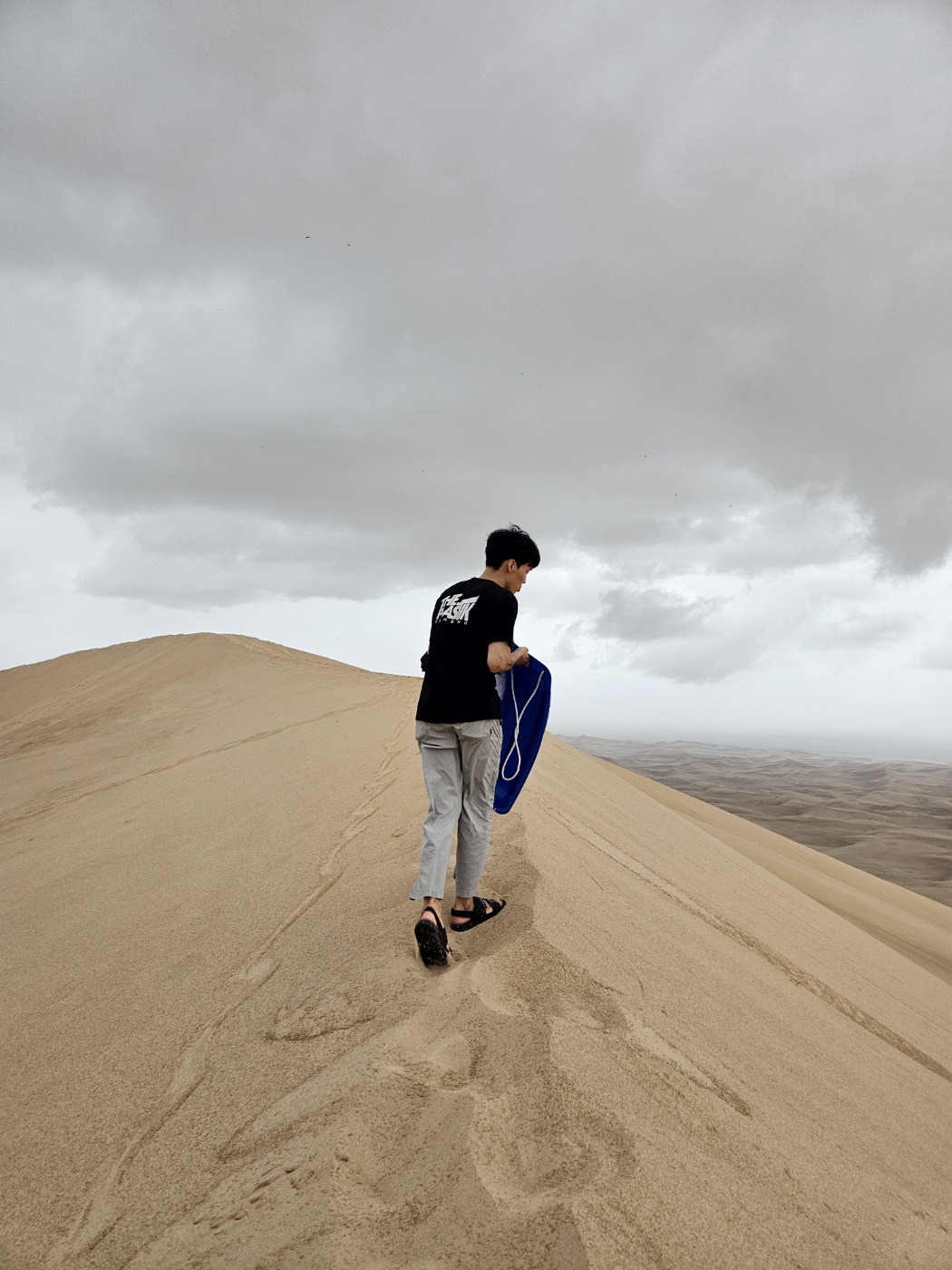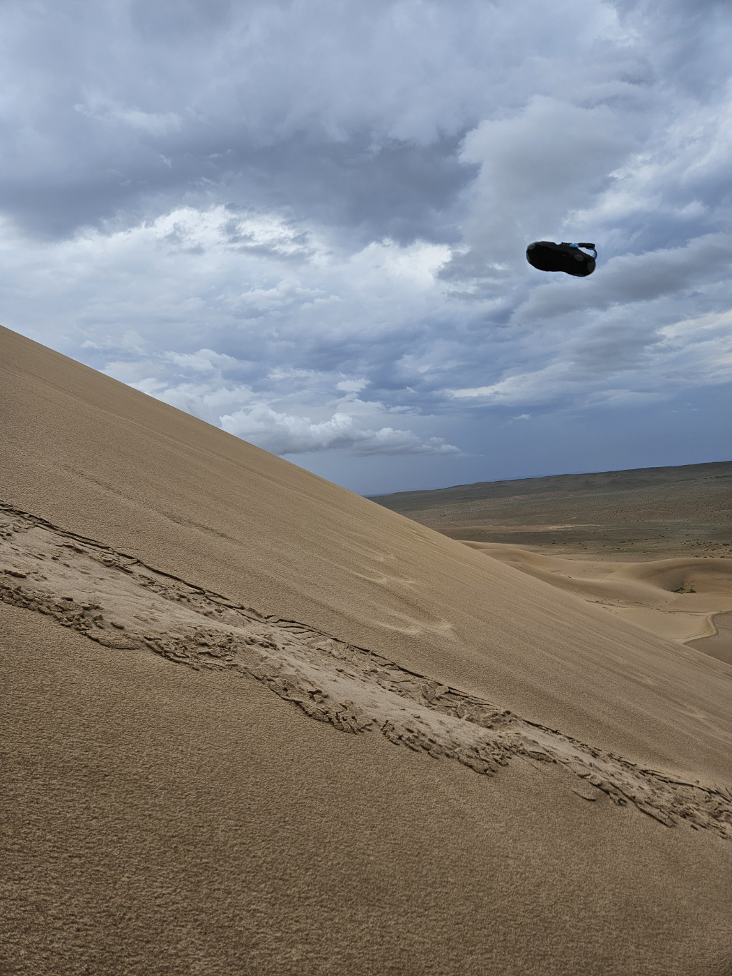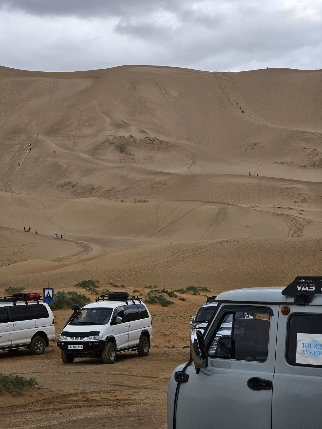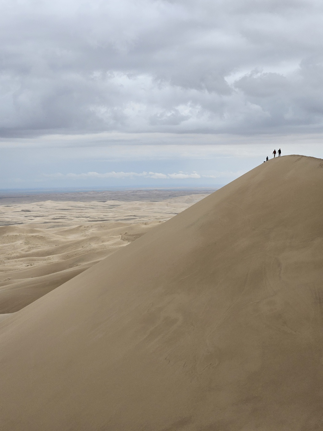 낙타를 타고 미소가 쉴래? 모래썰매 타러갈래?를 물어보길래 모래썰매를 타러간다고 했다. 날씨가 안좋아도 가면 괜찮아지겠지 싶었는데 큰 오산이었다. 사막은 멀리서 볼땐 와 크다~ 정도 였는데 가까이서 보니까 와 개크다~가 됐다. 근데 이걸 우리가 올라가야 된다고 한다...