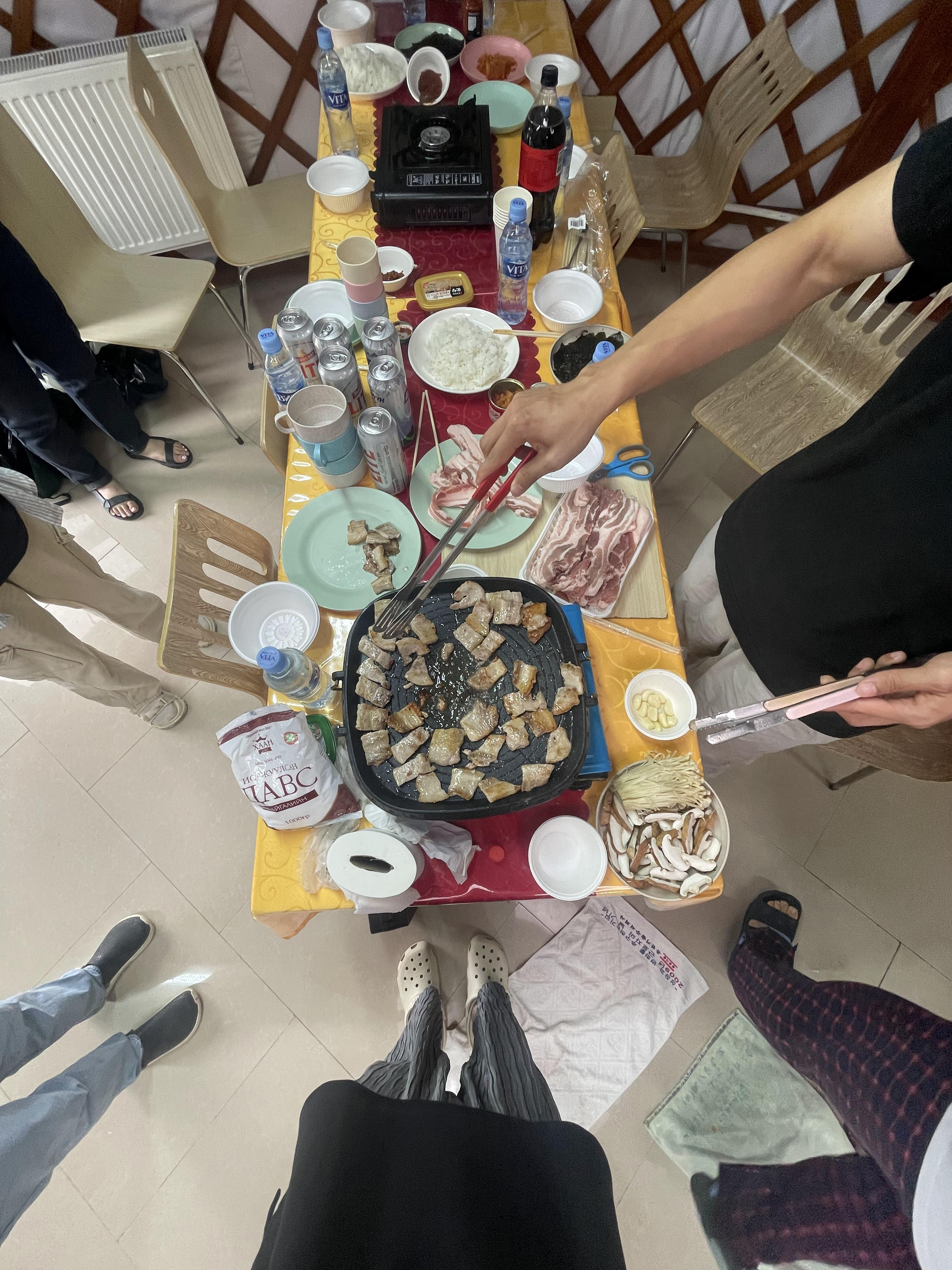 전날에는 닭볶음탕에... 오늘은 삼겹살? 이러다 살쪄서 돌아가는거 아닌가 싶었다. 이번 식사에 삼겹살, 버섯, 신라면 등등을 다같이 먹으니 바깥 날씨는 모르겠고 일단 굉장히 행복한 식사였다. 이름은 정확히 기억이 안나는데 미소가 몽골식 쌈장이라고 줬는데 뭔가 쌈장에 핫소스를 넣은 느낌...? 내 입맛에는 역시 안맞아서 나는 코리안 쌈장 먹었다. 한식 최고.