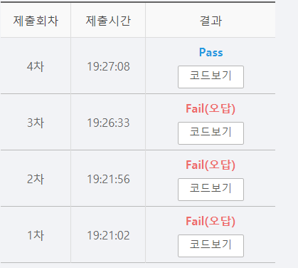 멍청하게 2중 for문안에 j>i를 해야하는데 j>0을 하는 바람에 계속 Fail 했다.. ㅋㅇㅋ