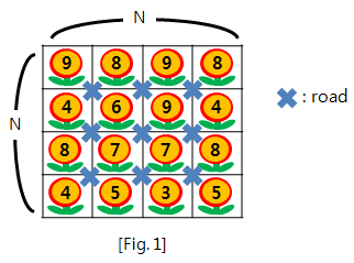 [Fig. 1]과 같이 한 변의 길이가 N인 정사각형 모양을 가진 지역에 디저트 카페가 모여 있다.