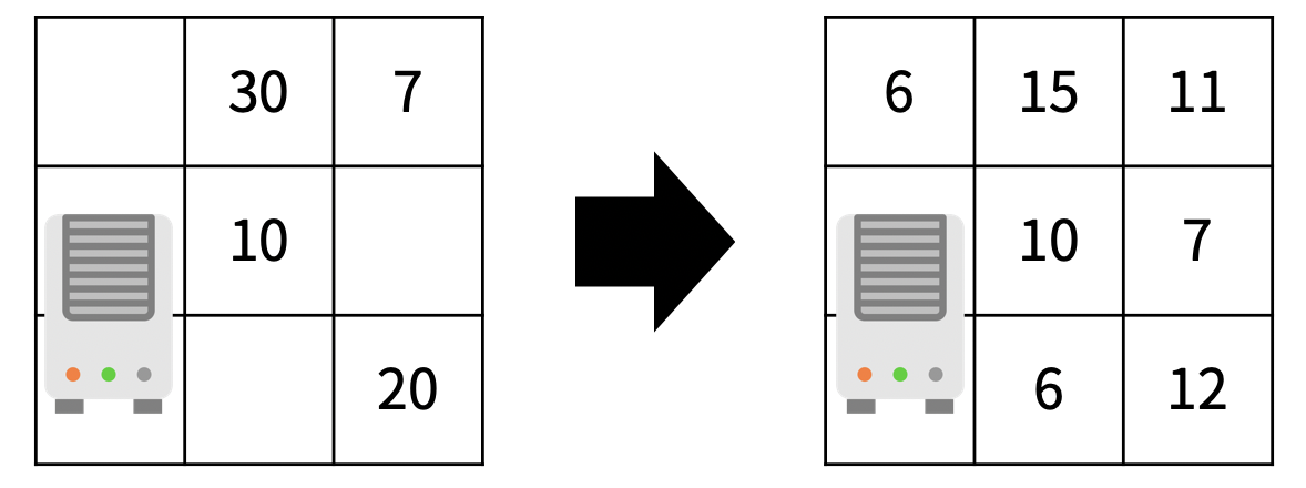 이것을 해결하기 위해 확산 양을 저장하는 행렬을 하나 따로 만든다. 확산을 다 하고 그 다음에 두 행렬을 합쳐준다.