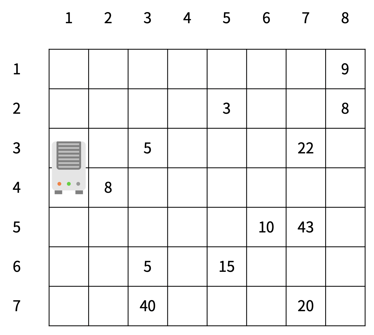 미세먼지를 제거하기 위해 구사과는 공기청정기를 설치하려고 한다. 공기청정기의 성능을 테스트하기 위해 구사과는 집을 크기가 R×C인 격자판으로 나타냈고, 1×1 크기의 칸으로 나눴다. 구사과는 뛰어난 코딩 실력을 이용해 각 칸 (r, c)에 있는 미세먼지의 양을 실시간으로 모니터링하는 시스템을 개발했다. (r, c)는 r행 c열을 의미한다.