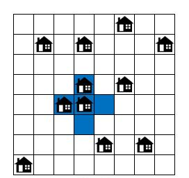 [Fig. 6]은 서비스 영역 K = 3으로 하여 홈방범 서비스를 제공할 때에 최대 5개의 집까지 서비스 제공이 가능한 경우 중 하나이다.